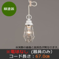 | 【商品セット内容】 ●スチール(緑塗装) ●丸環(緑塗装) ●小口ホルダー(緑塗装) ●E-26モーガルソケット ●黒コード ●引掛シーリングキャップ付 ●黒CPフレンジ ●丸木自在(茶)付 ●ビス止めガード |