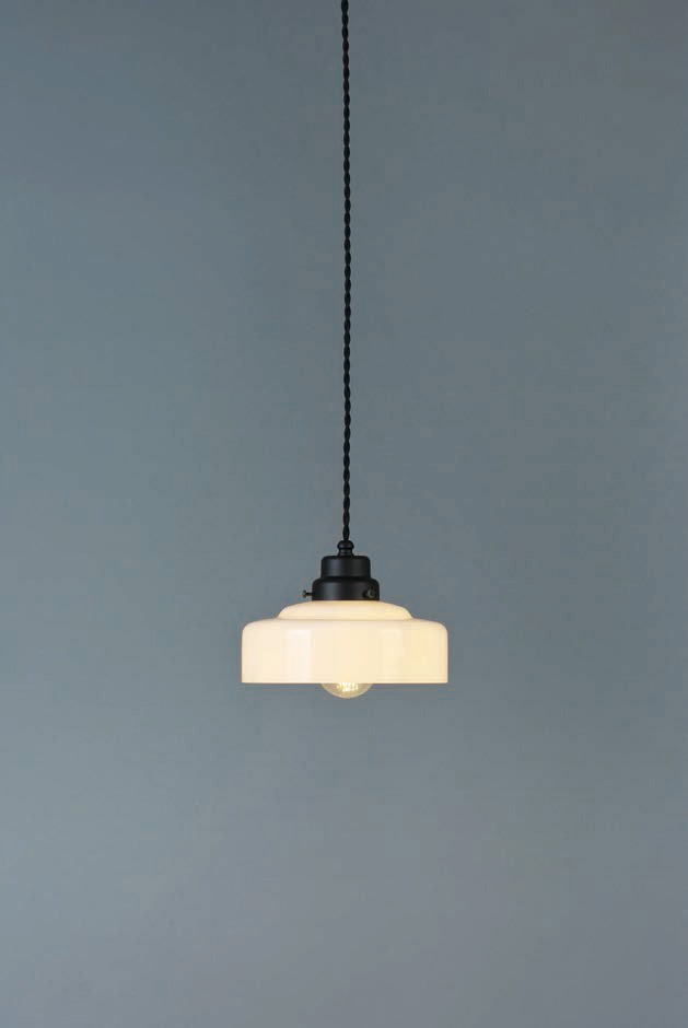 | 【商品セット内容】 ●浅盛硝子セード ●スチール(黒塗装) ●小口ホルダー(黒塗装) ●E-26モーガルソケット ●黒ネジリコード ●引掛けシーリングキャップ付 |