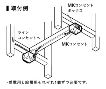 ![]() ■什器用コンセント 什器にMKコンセントを2個取り付ければ、 片方で受電、もう片方では給電が可能です。 |